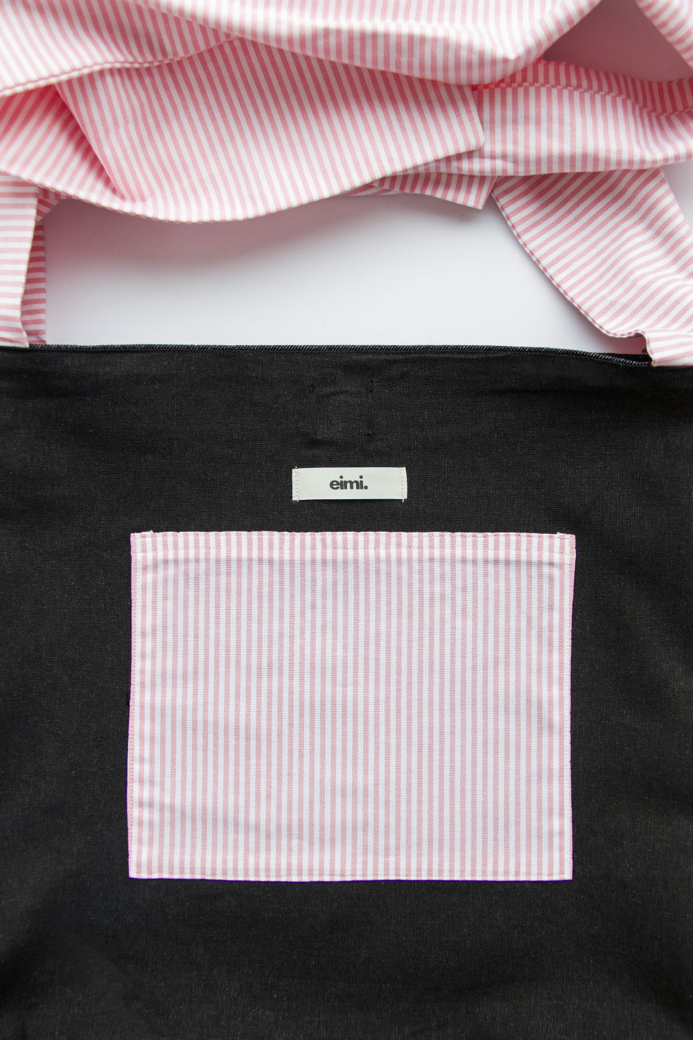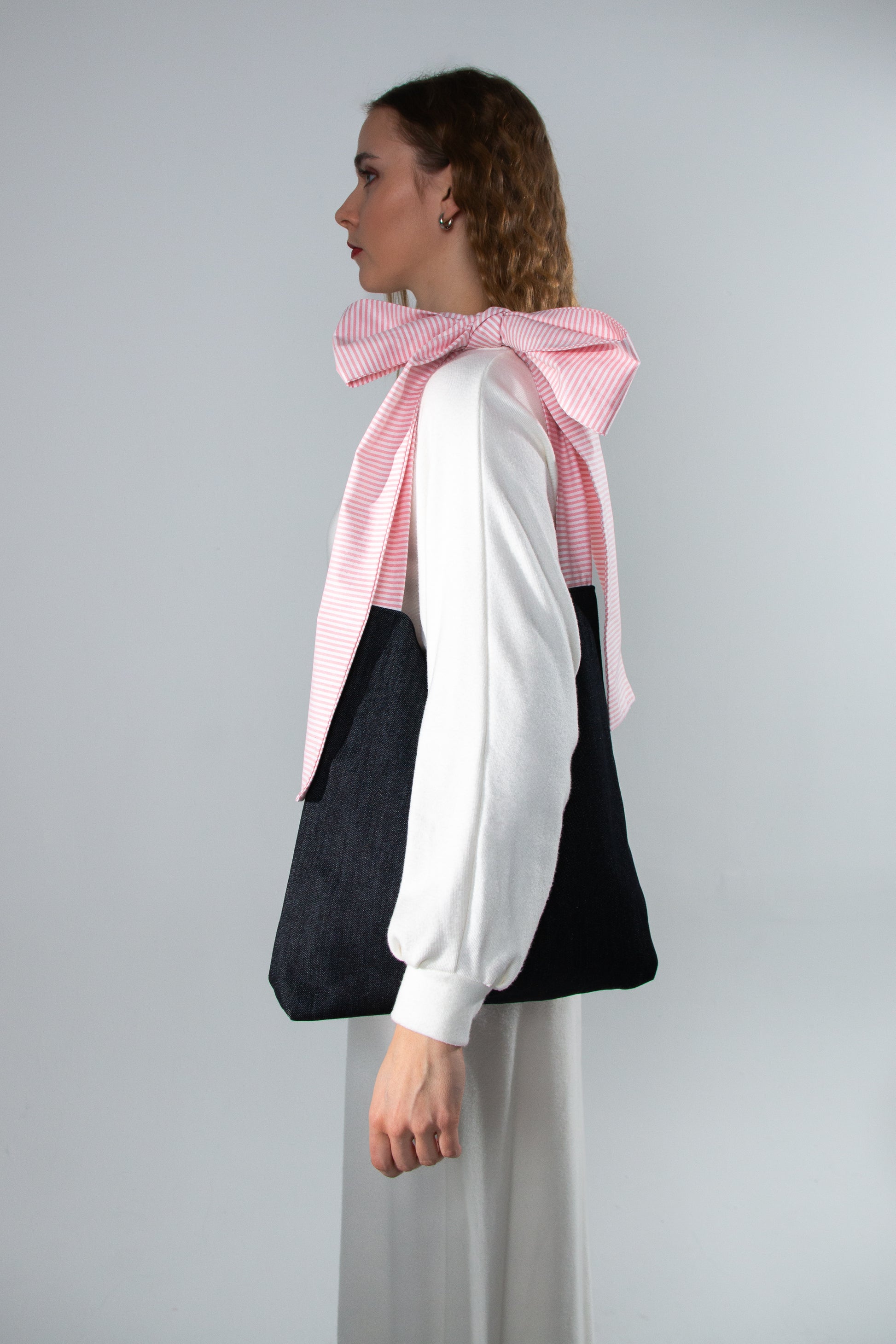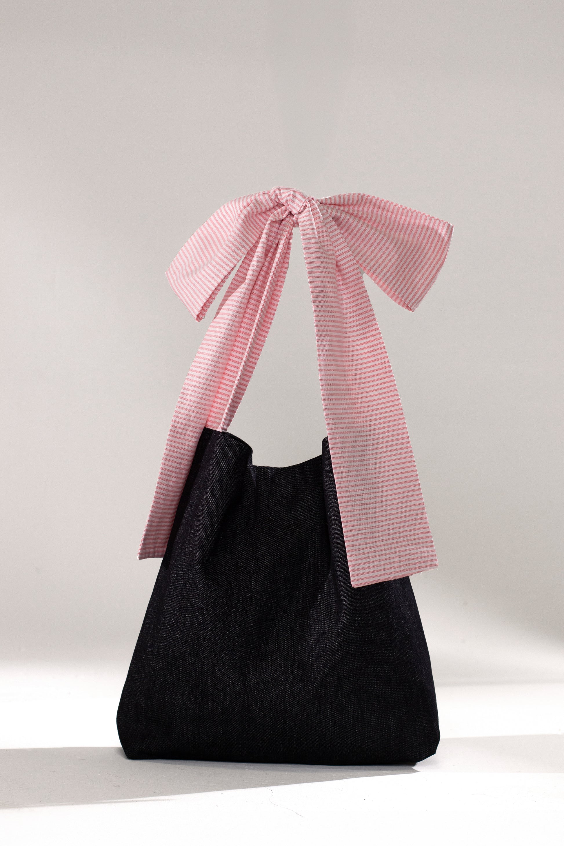 Handmade denim shoulder bag with striped pink adjustable straps.