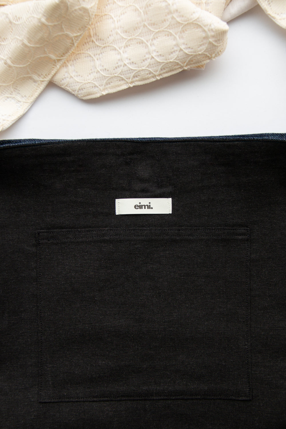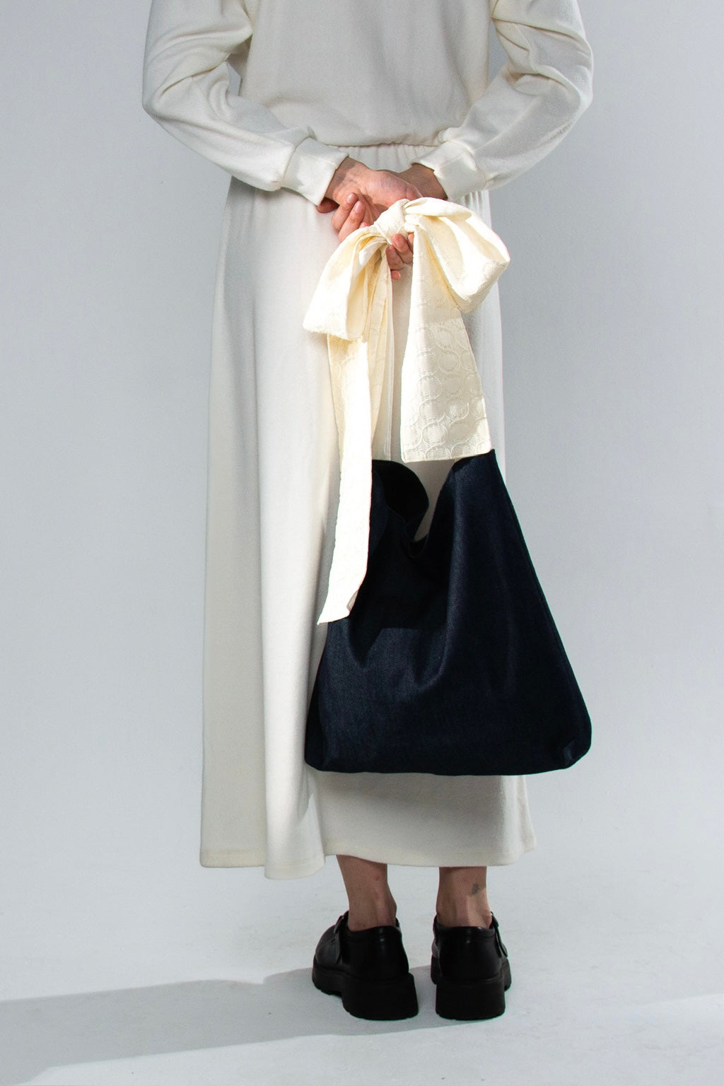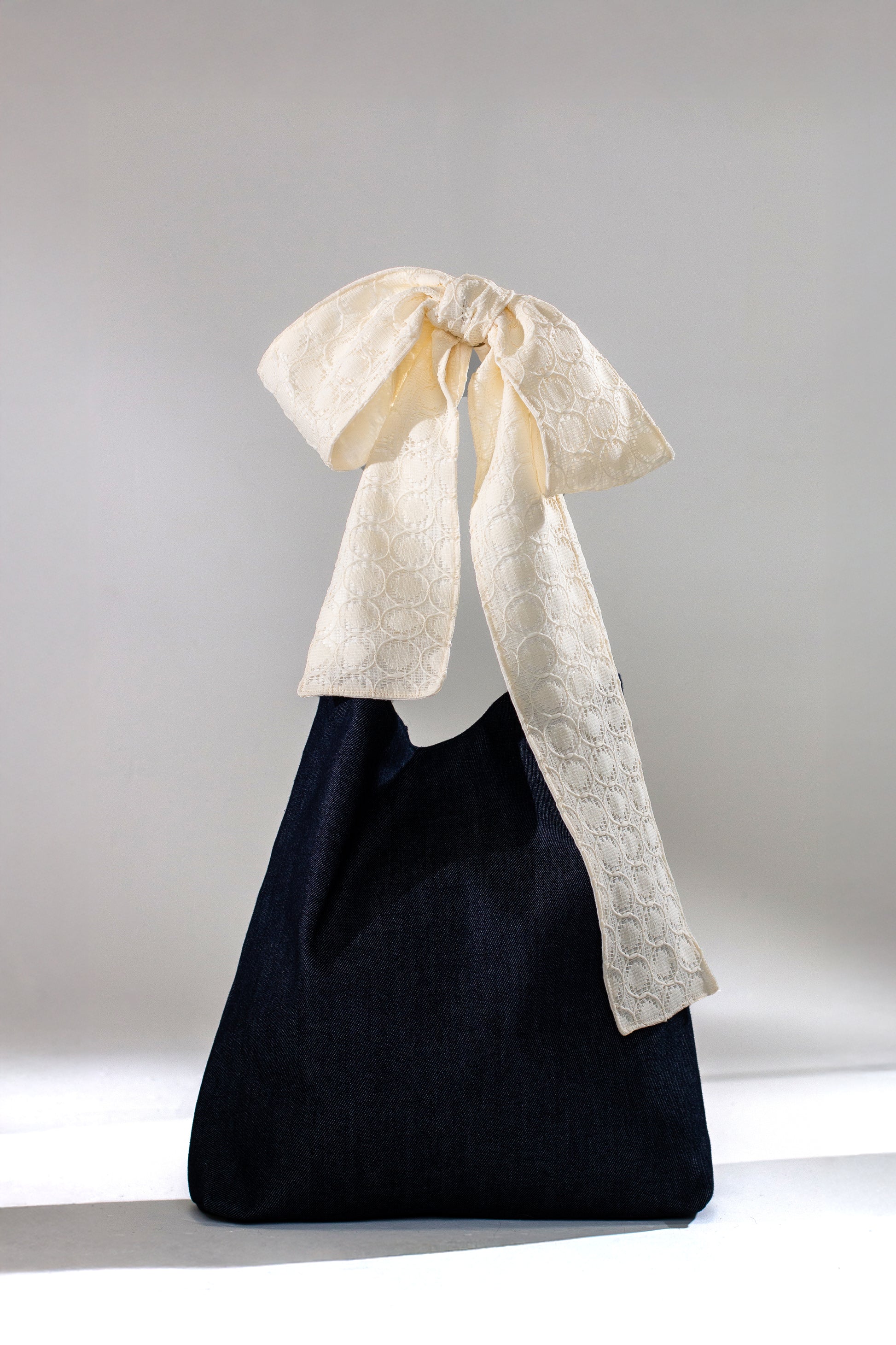 Handmade denim shoulder bag with off white lace adjustable straps.