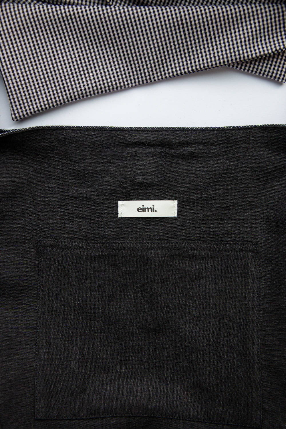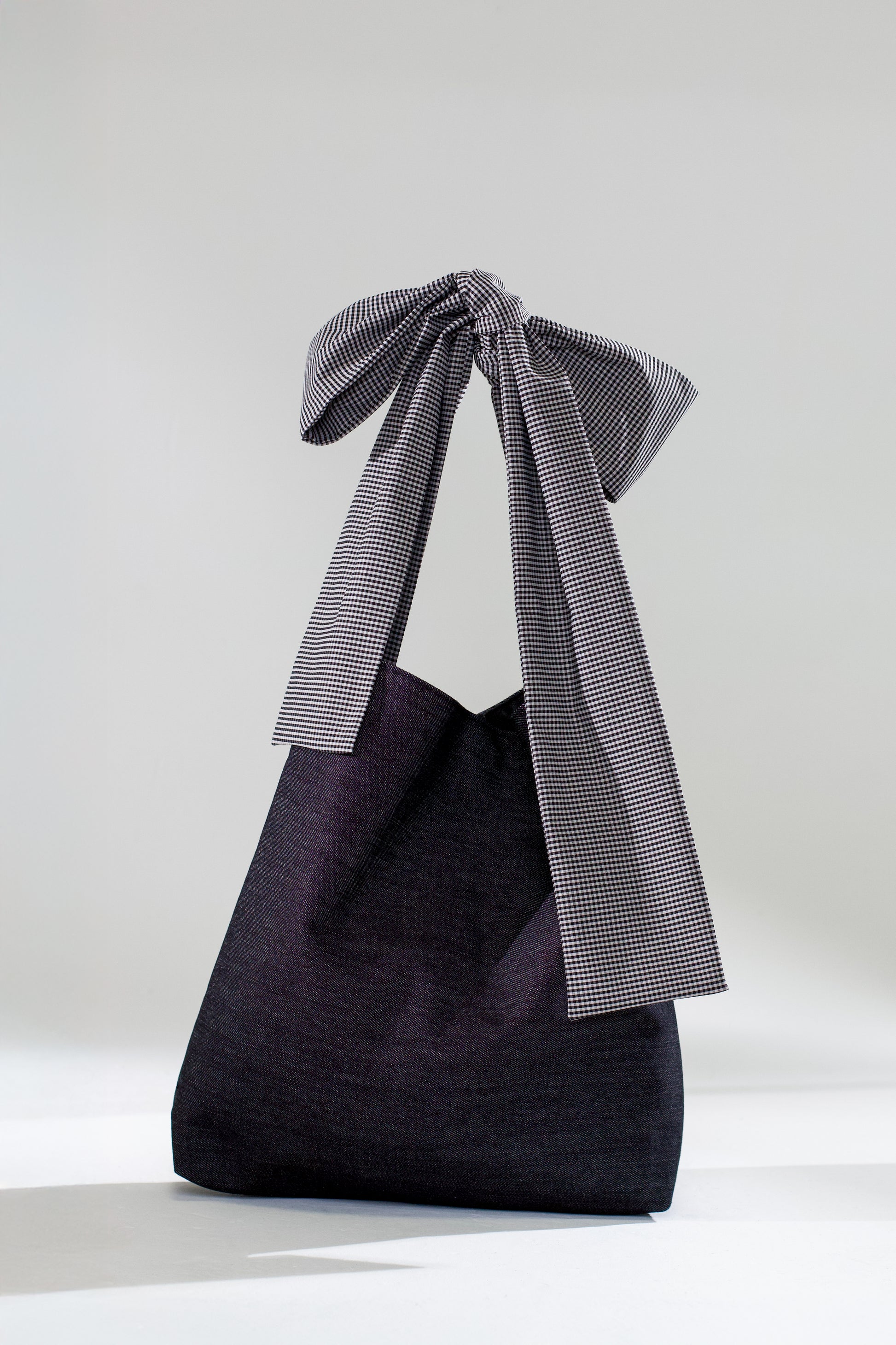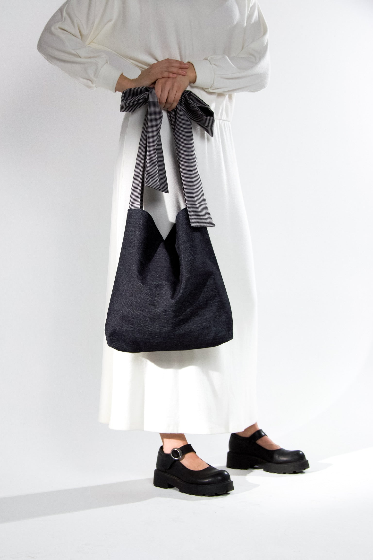 Handmade denim shoulder bag with b&w checkered adjustable straps.
