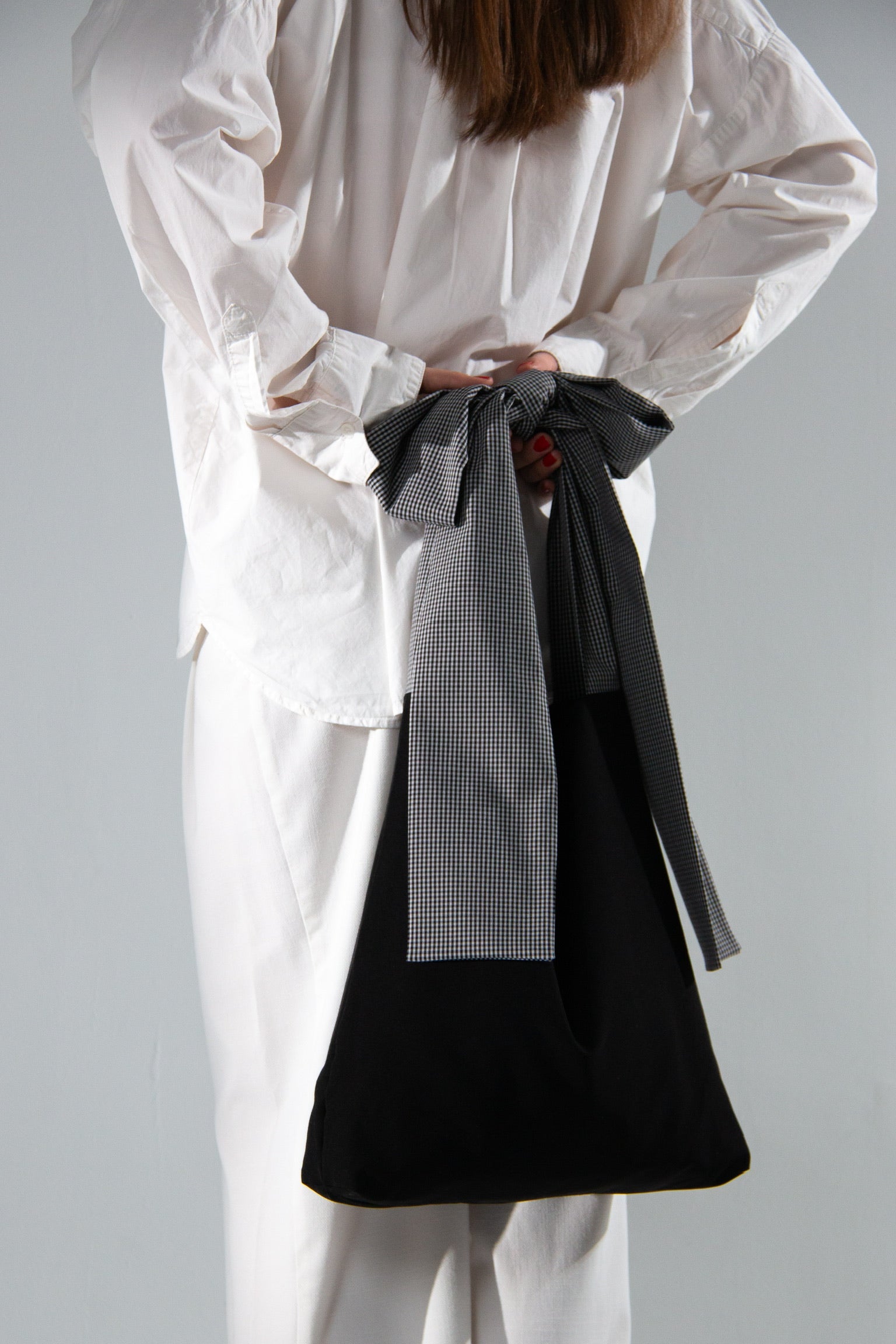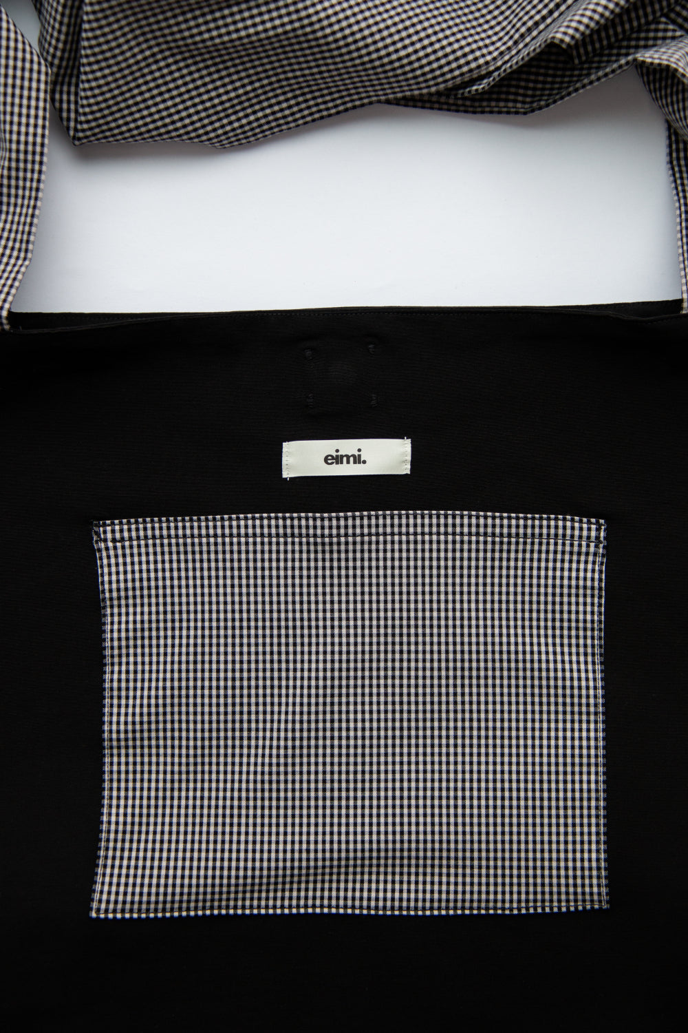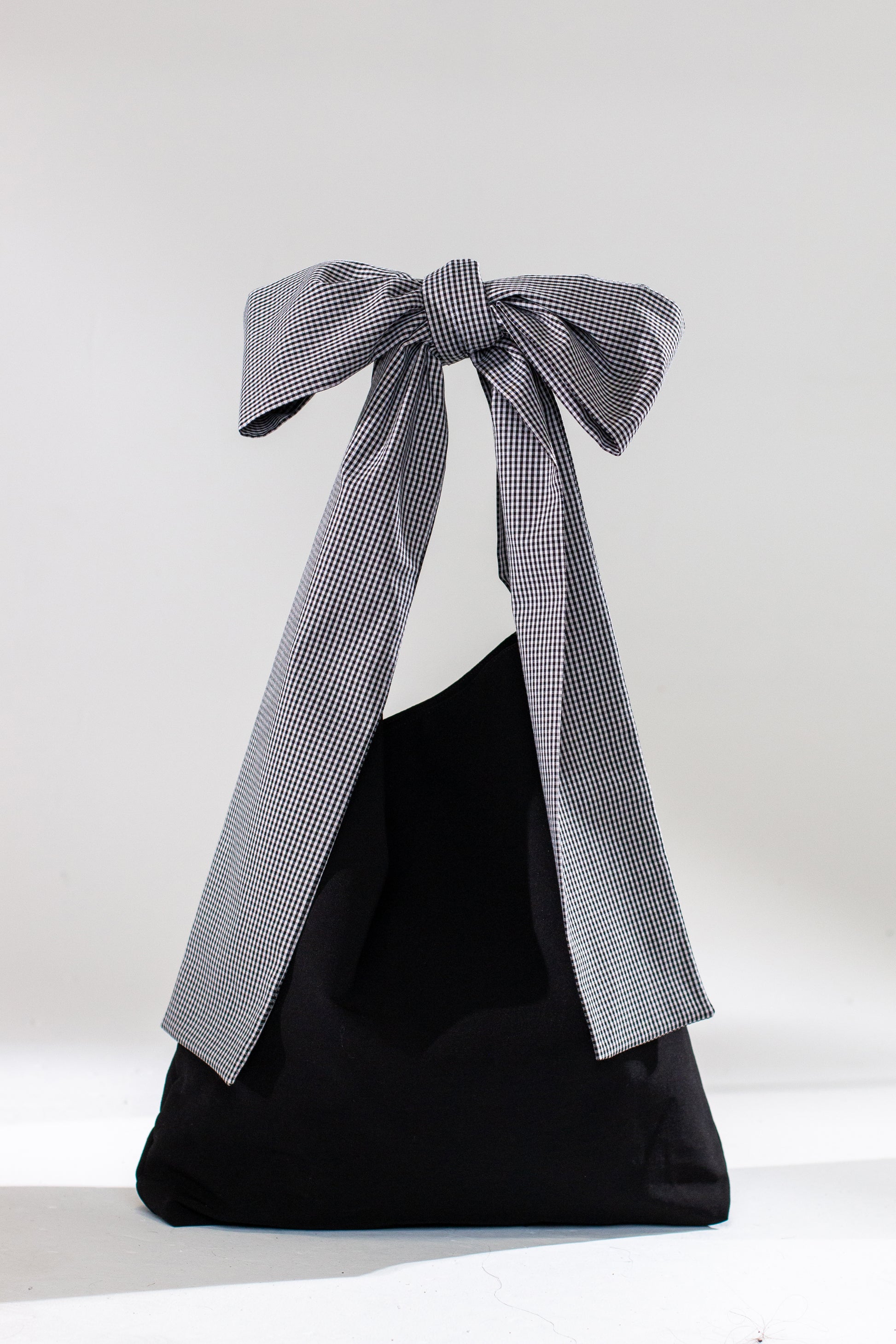 Handmade black shoulder bag with b&w checkered adjustable straps.